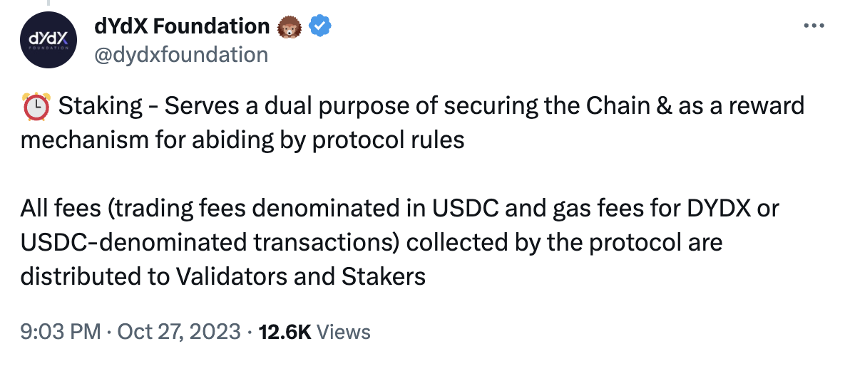 10 月 27 日,dYdX Chain 作为独立的 Cosmos Layer 1 正式在主网上线,验证者于凌晨 1:00 创建了 dYdX Chain 的创世区块。dYdX 基金会还表示,每次提交新区块时,dYdX Chain 产生的所有费用都会分配给验证者和质押者,包括 USDC 计价的交易费用和 DYDX 计价的 Gas 费用。