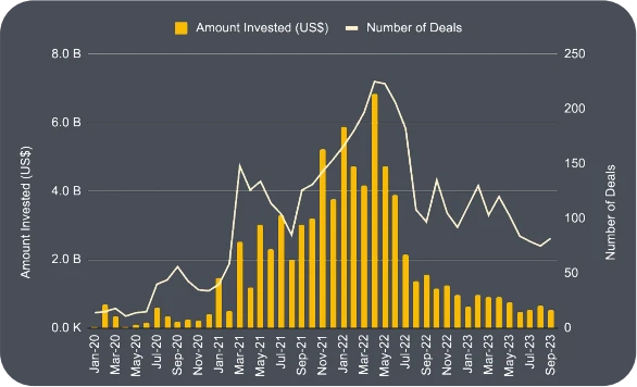 · 在 2021 年和 2022 年早期的大热牛市,融资总额持续增长。融资金额在 2022 年 4 月达到峰值,达 68 亿美元,相较于 2021 年 1 月的金额增长了 361.8% 。