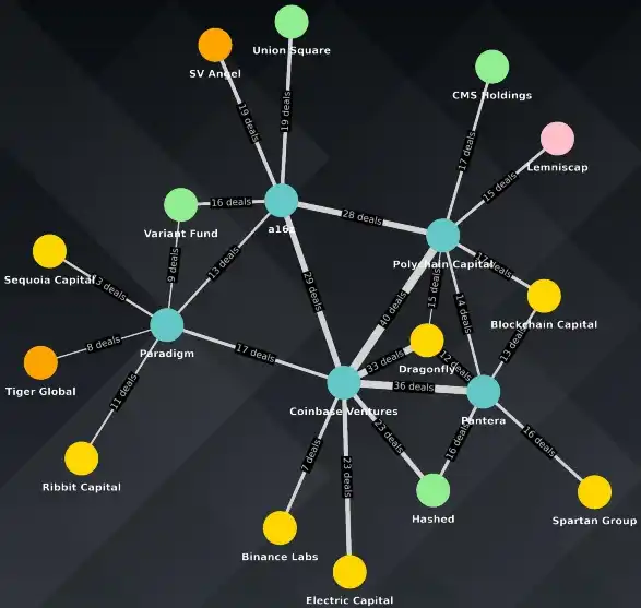 · 该图显示,Polychain Capital 和 Coinbase Ventures 的 共同投资数量最多(40 宗)。这可能是因为 Polychain 的创始人 Olaf Carlson-Wee 曾是 Coinbase 的首席风 险官。
