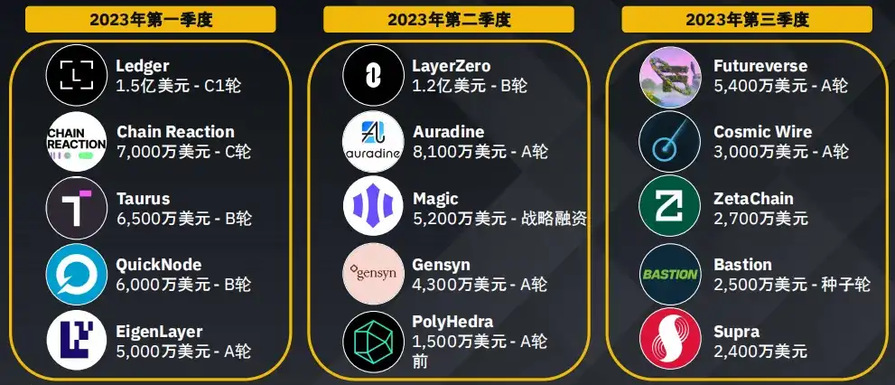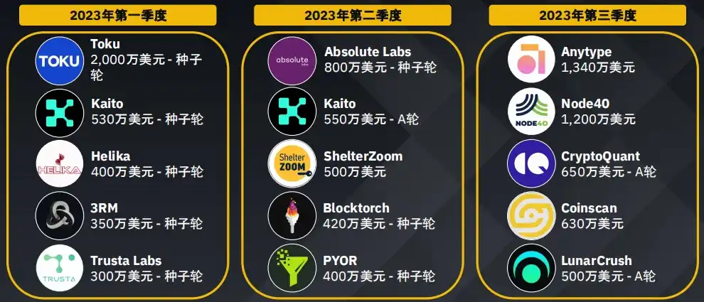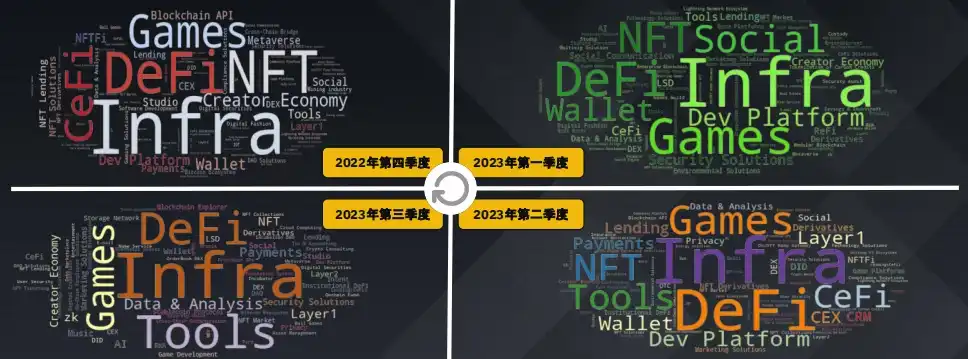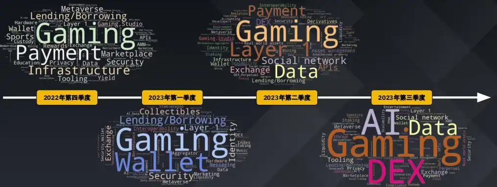 游戏领域持续吸引风险投资的兴趣,这表明人们对这一新兴领域充满期待,最近几个季度人工智能和数据领域的获投也有所上升。2023 年第三季度主要转向了包括 DEX 在内的四大板块。