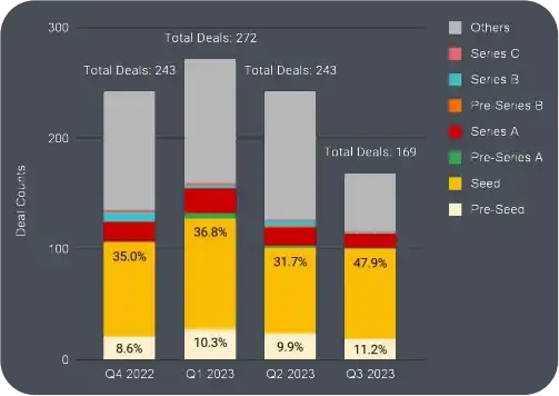 · 上个季度的种子轮融资占比飙升至 47.9% 。尽管总体交易数量有所下降,但种子轮项目在 2023 年第二季度到第三季度之间从 77 个增加到 81 个。