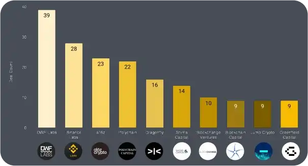 与此同时,Coinbase Ventures 和 Shima Capital 等公司的投资数量减少,或表明这些公司的投资筛选更加严格化。尽管如此,二 者仍是活跃的投资方 , Coinbase Ventures 达成 19 宗交易,Shima 为 17 宗。
