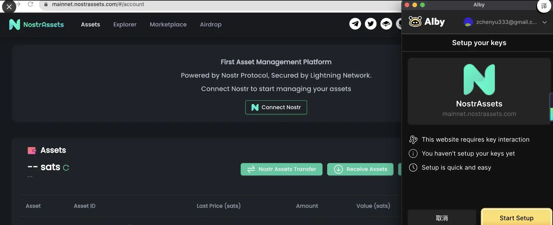 1、Connect Nostr→Start Setup→保存好助记词(一个个查看记下)→Nostr 公钥生成→此时可连接到网站