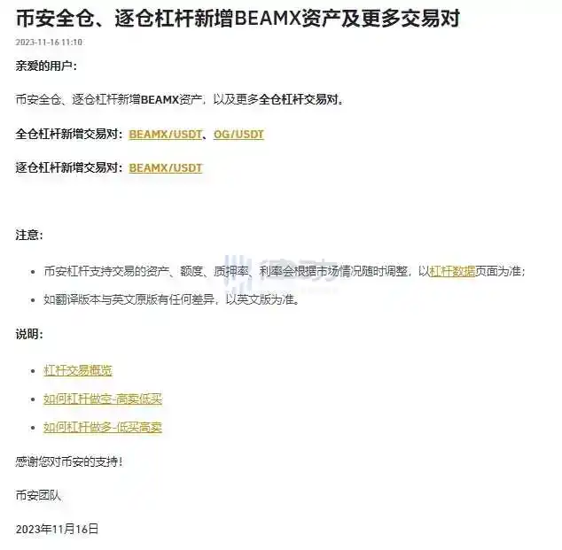 全仓杠杆新增交易对:BEAMX/USDT、OG/USDT;