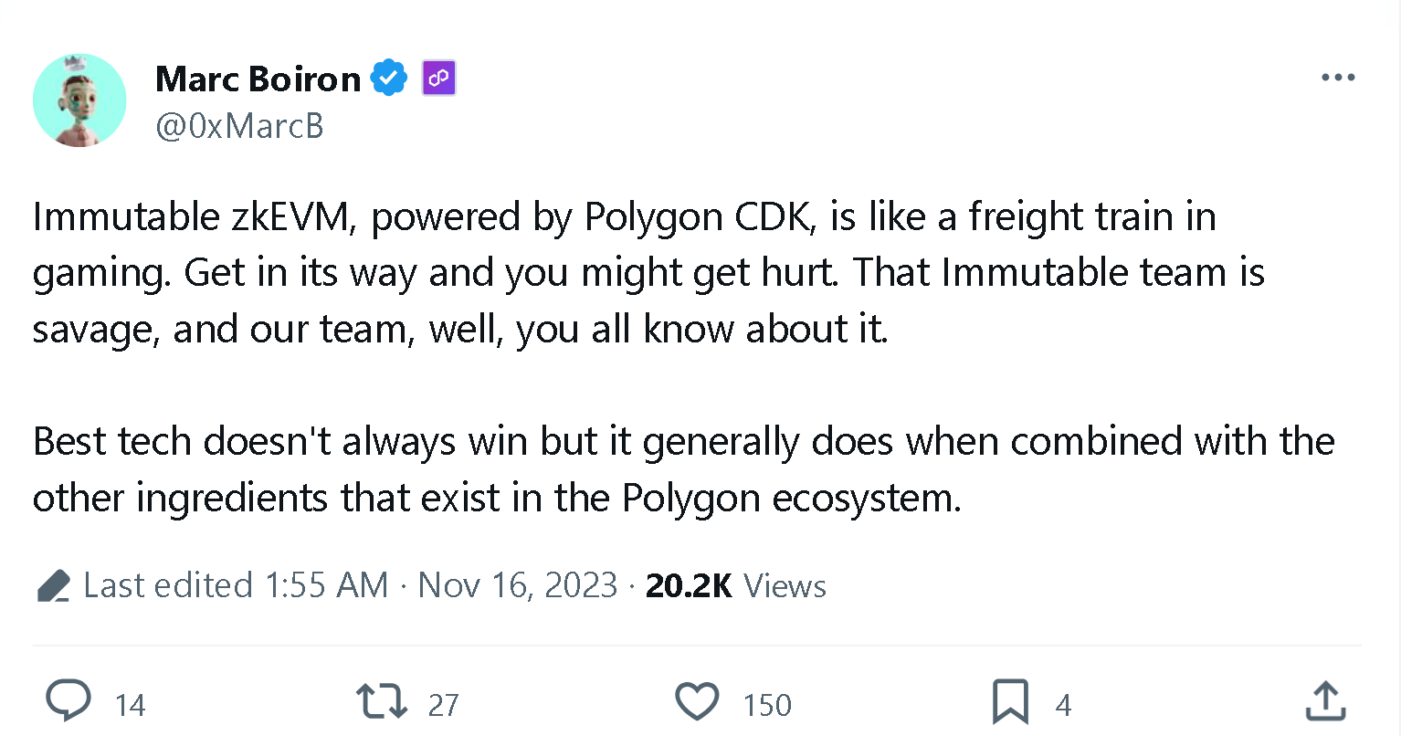 由于精明的商业发展团队,这个项目长期以来在合作伙伴关系方面取得了卓越的成就,开始吸引更大的合作伙伴加入其闪亮的技术堆栈,其中包括 Web3 游戏链 Immutable,该链正在启动由 Polygon 支持的 Immutable zkEVM。