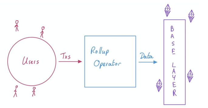 据以太坊基金会研究科学家 @barnabemonnot 的解释说明,我们可在 Rollup 系统中分出三个主要角色:用户、Rollup 运营商和基础层。他们运行的主要流程大致为:当用户在 L2 上进行交易,Rollup 运营商充当着用户和基础层之间的接口角色,并最终将数据发布到基础层,如下所示: