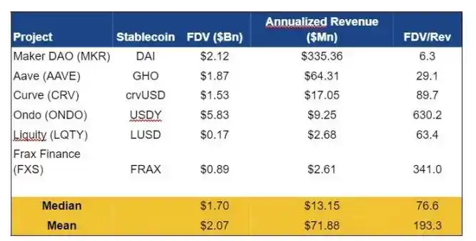 该模型的关键部分是应采用完全摊薄估值(FDV)与收入的比率。这始终是一个猜测游戏,但我将根据可比的 DeFi 稳定币项目提出一些未来的路径。