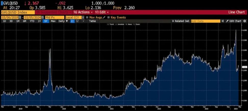 美国政府证券流动性指数图表清楚地显示自 COVID 以来美国国债市场流动性的下降(数字越大,流动性状况越差)。只需少量抛售就能扰乱市场。我所说的扰乱市场是指债券价格迅速下跌或收益率上升。