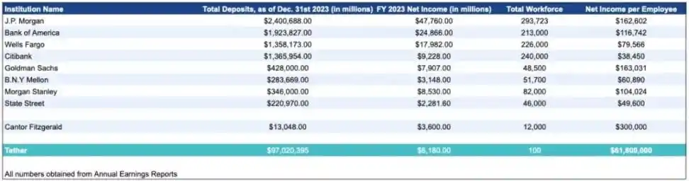 如果这些银行的首席执行官们没有通过谈判获得 Tether 的股权,以换取银行服务,那他们就是傻瓜。当我稍后介绍 Tether 的员工人均收入指标时,你就会明白其中的原因。
