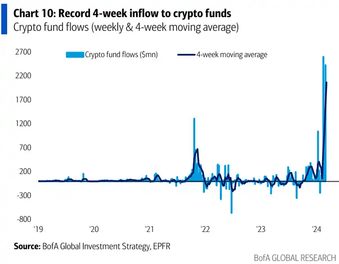 根据 EPFR 统计口径,资金大幅流入货币基金、投资级债基金和股票基金,创纪录流入加密货币基金,流出科技股和能源股基金。