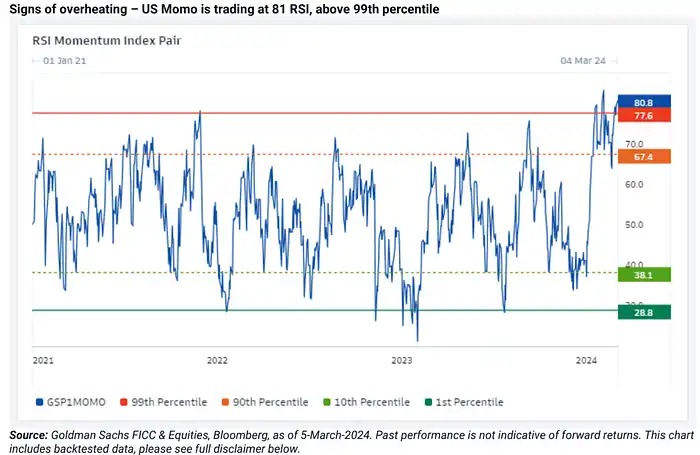 Momentum 股票继续表现强势,大家一直担心动能强的股票涨势衰竭,但市场依然展现出了对人工智能、企业盈利改善、衰退担忧减退、加密货币屡创新高等长期主题的信心。高盛统计的动量因子今年以来已经上涨超过 20%,创下了历史同期最好成绩。从相对强弱指标 (RSI) 来看,动量美股已经进入严重超买区域, 高于 99% 的历史分位水平。