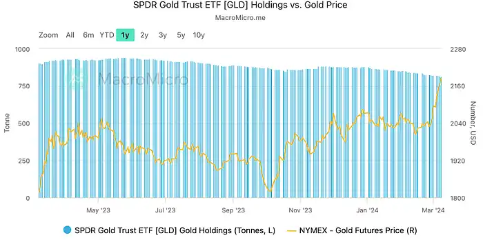 最近在美国上市的现货比特币 ETF 在上周继续吸纳比特币——目前持有 2100 万枚比特币的大约 4%,价值 546 亿美元,几乎追平最大的黄金 ETF GLD 的 560 亿美元 AUM。
