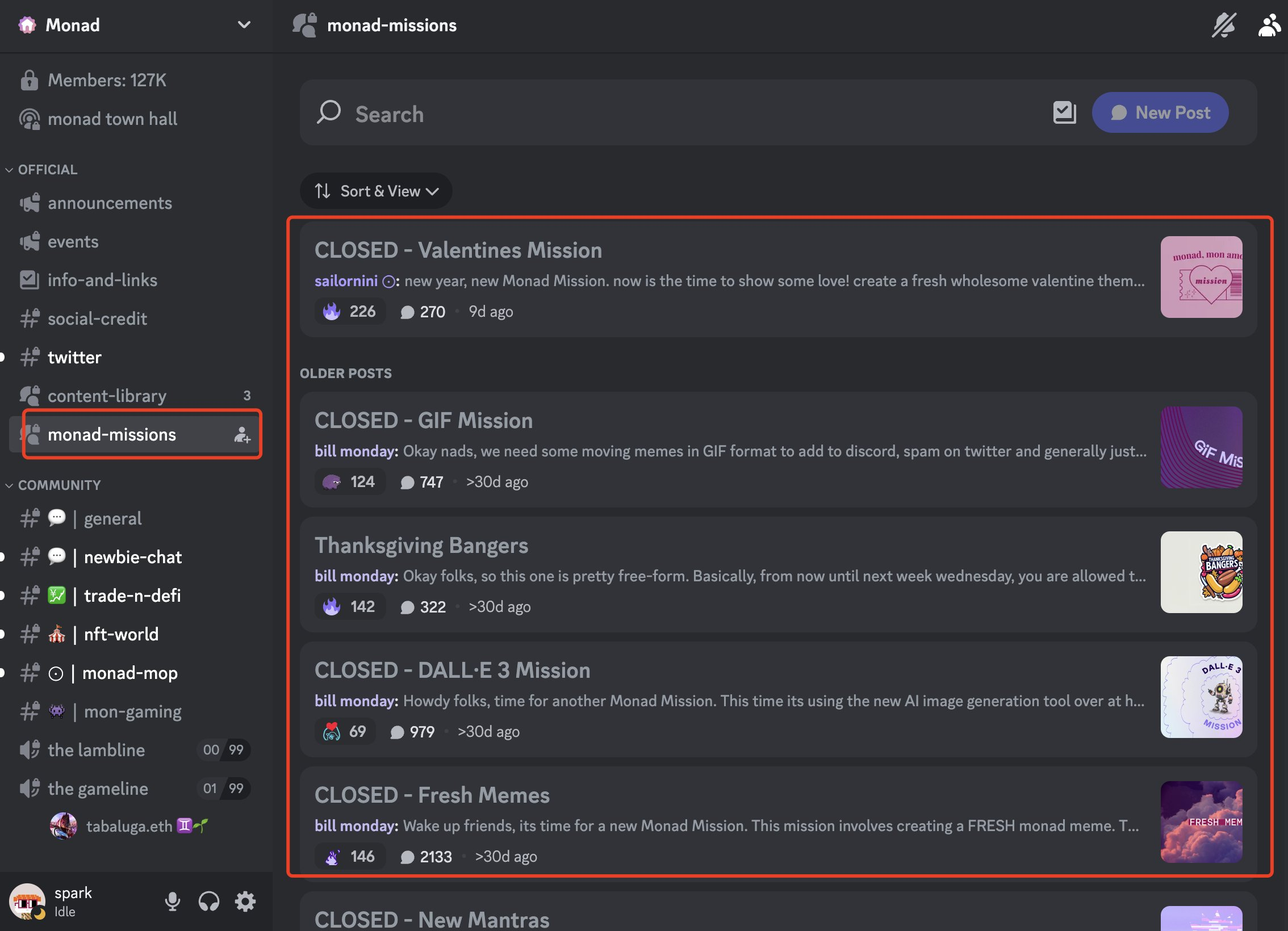 这里注意需要是有质量的聊天,比如讨论技术,币圈实时信息,一些幽默的对话等等,在社区让更多的人看到你!大部分用户都在 general 频道聊天,你可以选择在那里加入他们!比如 Gmonad 就是从社区开始的,大家也都喜欢说 GMonad,而不是 GM。