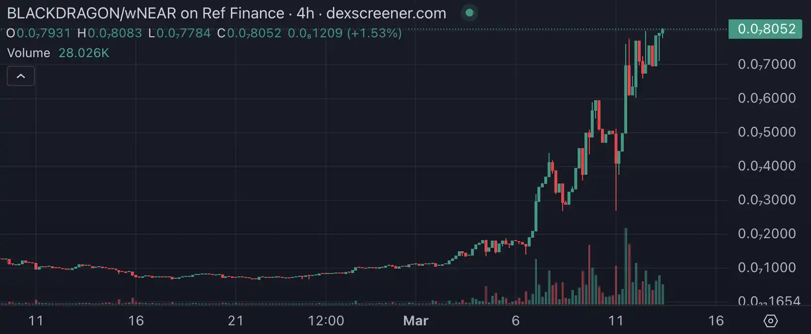 与此同时,生态中的 meme 币 BLACKDRAGON 也再一次「复活」,自底部已上涨 700%,截止撰稿时,其价格为 0.0(7)8 美元,24 小时涨幅达 15%。