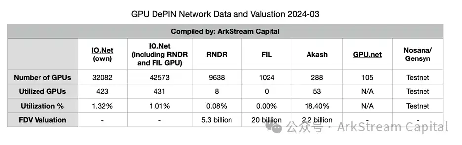 图片来源:ArkStream Research; 数据来源:io.net, depinhub.io, stats.akash.network