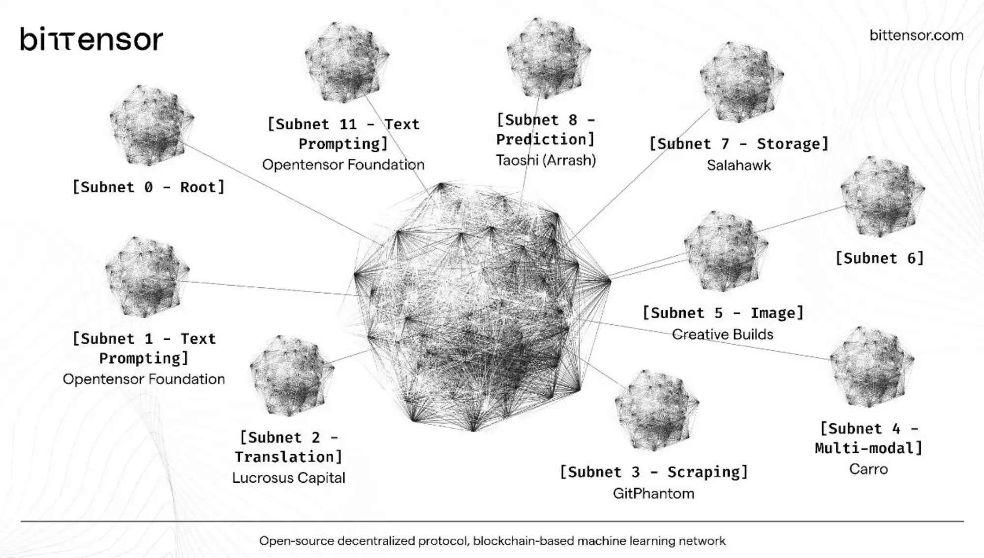 Bittensor 采用的子网络模型是其架构的一大特点,这些子网络专注于特定任务的执行。通过这种方式,Bittensor 试图实现模型的复合和去中心化的智能,尽管这一目标在当前技术和理论的限制下仍面临挑战。