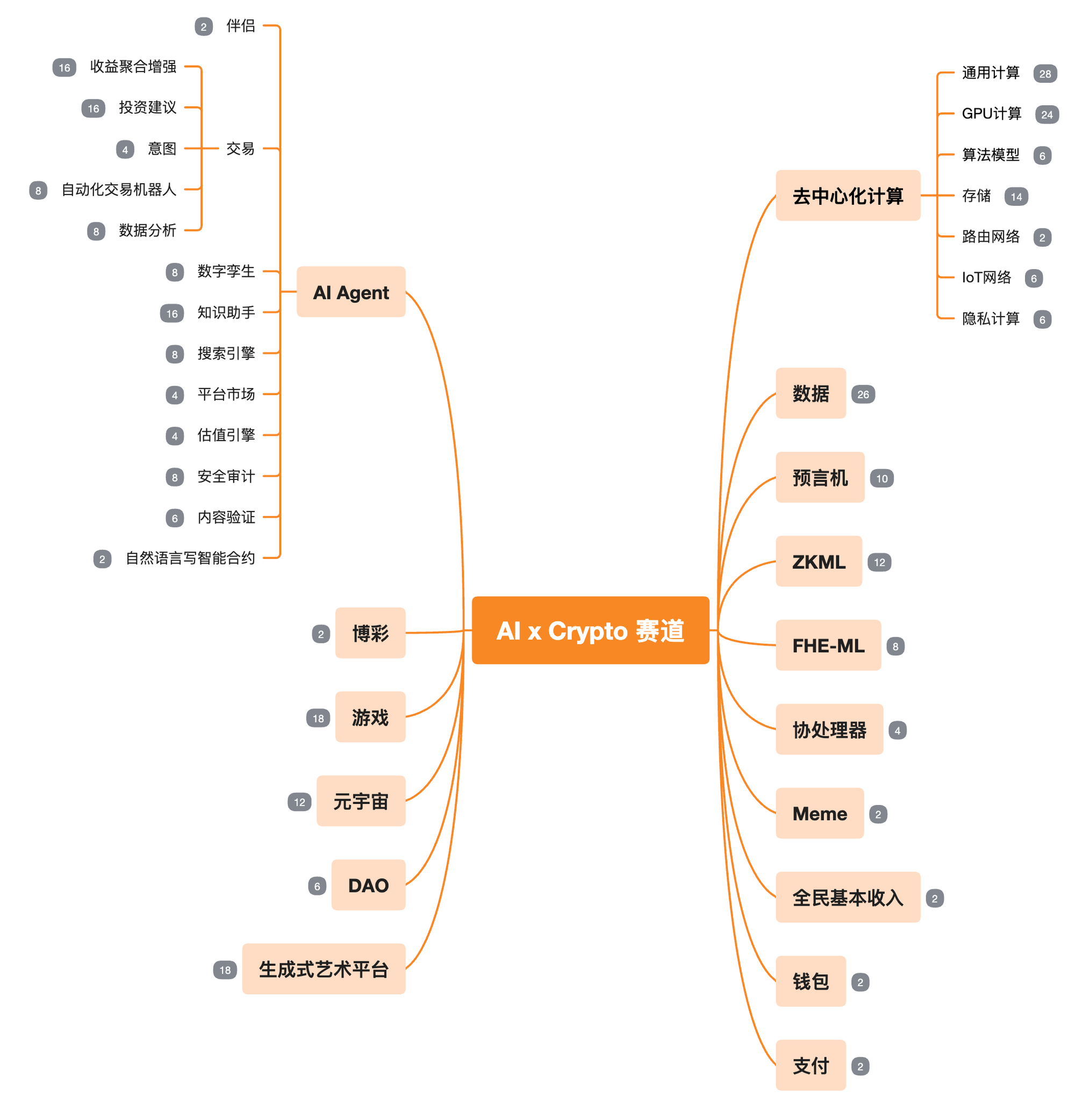 2.在 AI x Crypto 领域中,我们可以看到多个细分领域,包括 AI Agent、去中心化计算、数据、预言机、ZKML、FHEML、协处理器、Meme、全民基本收入、生成式艺术平台以及游戏等应用。在这些领域中,去中心化计算尤其引人瞩目,无论是 GPU 计算还是算法模型,都代表着巨大的创新空间,且对算力的需求极高,算力成为一种共识形式,其价值潜力可以与公链的市值天花板相媲美。同时,我们也看好 ZKML、FHEML 和协处理器这些尚处于早期阶段但潜力巨大的领域。