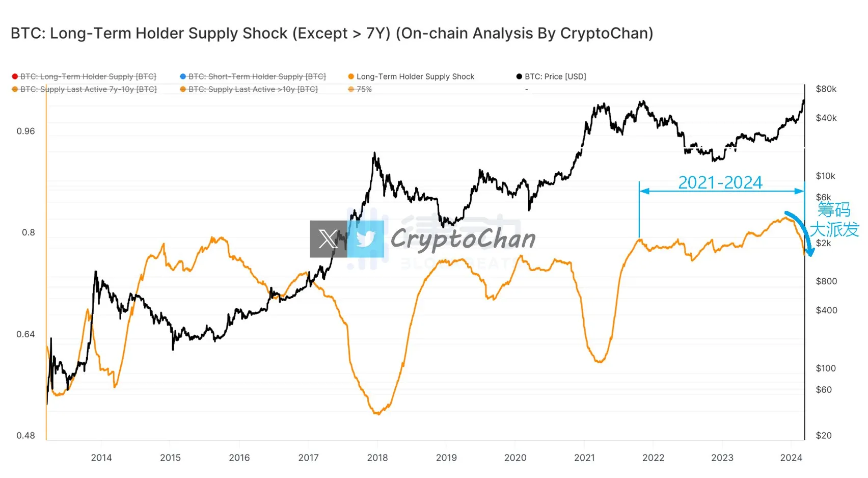 据链上分析师 @0xCryptoChan,比特币价格在持续走高之际,链上持币大于 155 天的 BTC 持有者持币总量占 BTC 总流通量百分比却在下降,这意味着流动性在向比特币之外的方向转移。