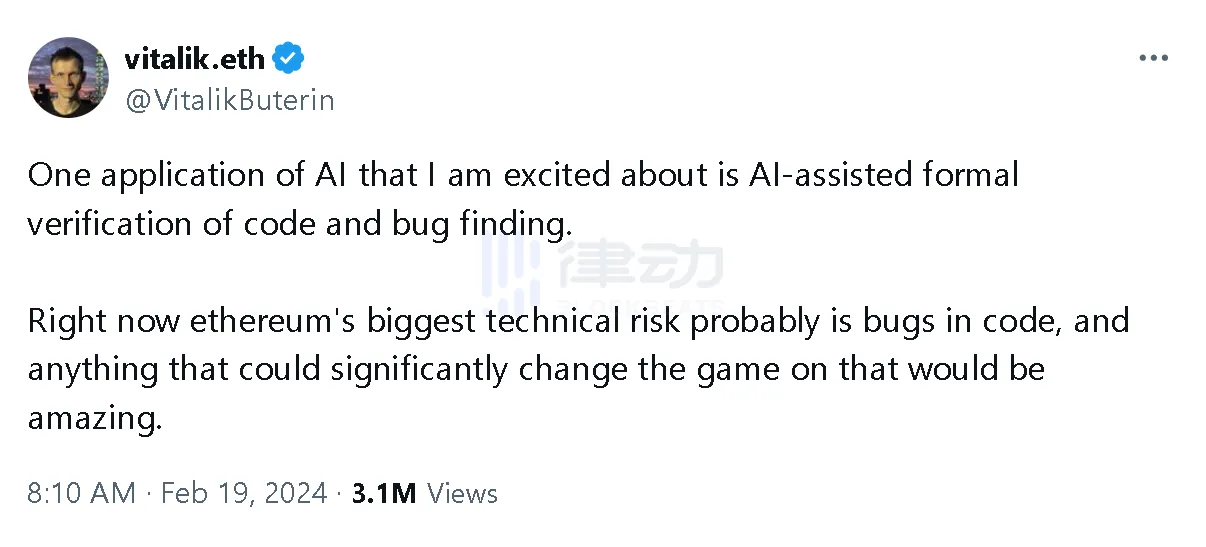 此外,以太坊联合创始人 Vitalik Buterin 也于社交平台发文称,「我对一种应用人工智能的技术感到兴奋,那就是 AI 辅助的代码形式验证和漏洞发现。目前以太坊最大的技术风险可能是代码中的漏洞,任何能够显著改变这种情况的技术都将是了不起的。」