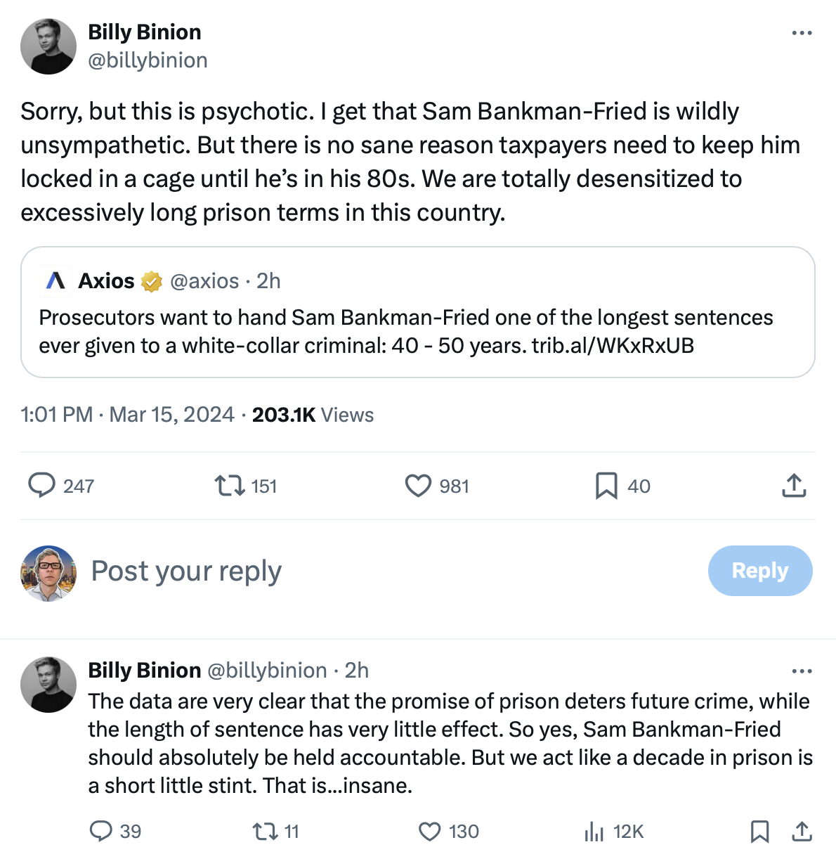 检察官说,40-50 年的刑期 "将允许被告在向社会保证他不会有机会重新从事欺诈和欺骗活动后重获自由",但仍然 "反映了被告罪行的严重性"。他们还要求对被告做出 110 亿美元的判决。