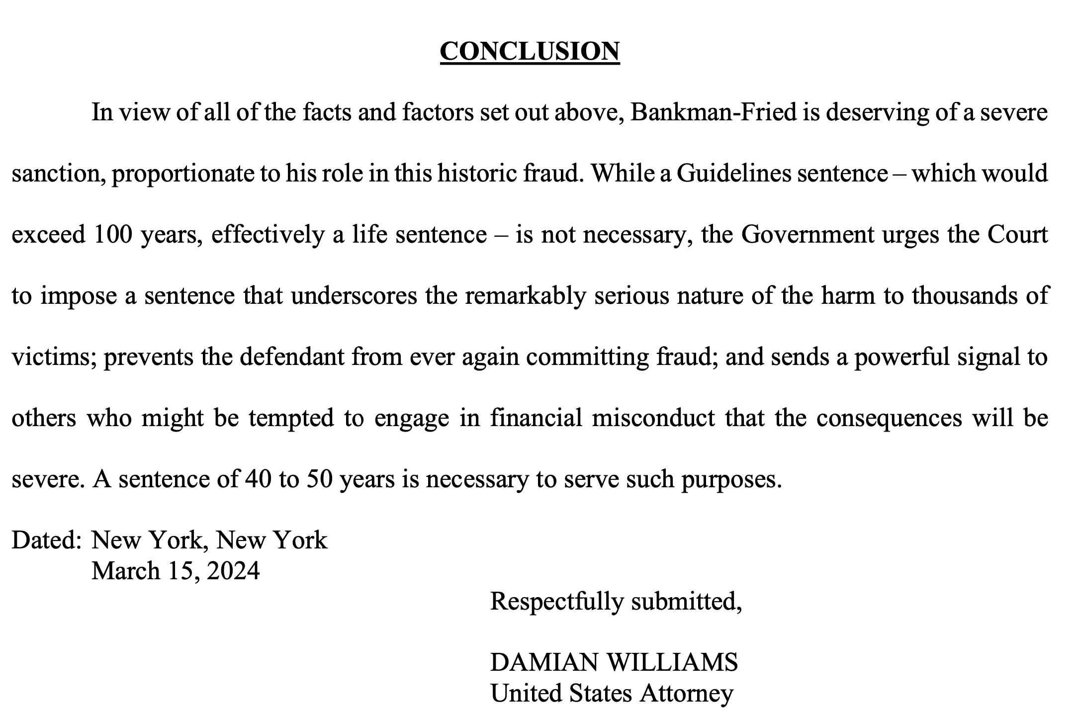 3 月 15 日,政府向路易斯-卡普兰(Lewis Kaplan)法官提交了一份长达 116 页的量刑备忘录,其中详细叙述了班克曼-弗里德的活动,重点有五点: 班克曼-弗里德的非法政治献金计划、试图贿赂中国政府官员、银行业不当行为、试图推卸责任以及各种妨碍司法公正的行为。