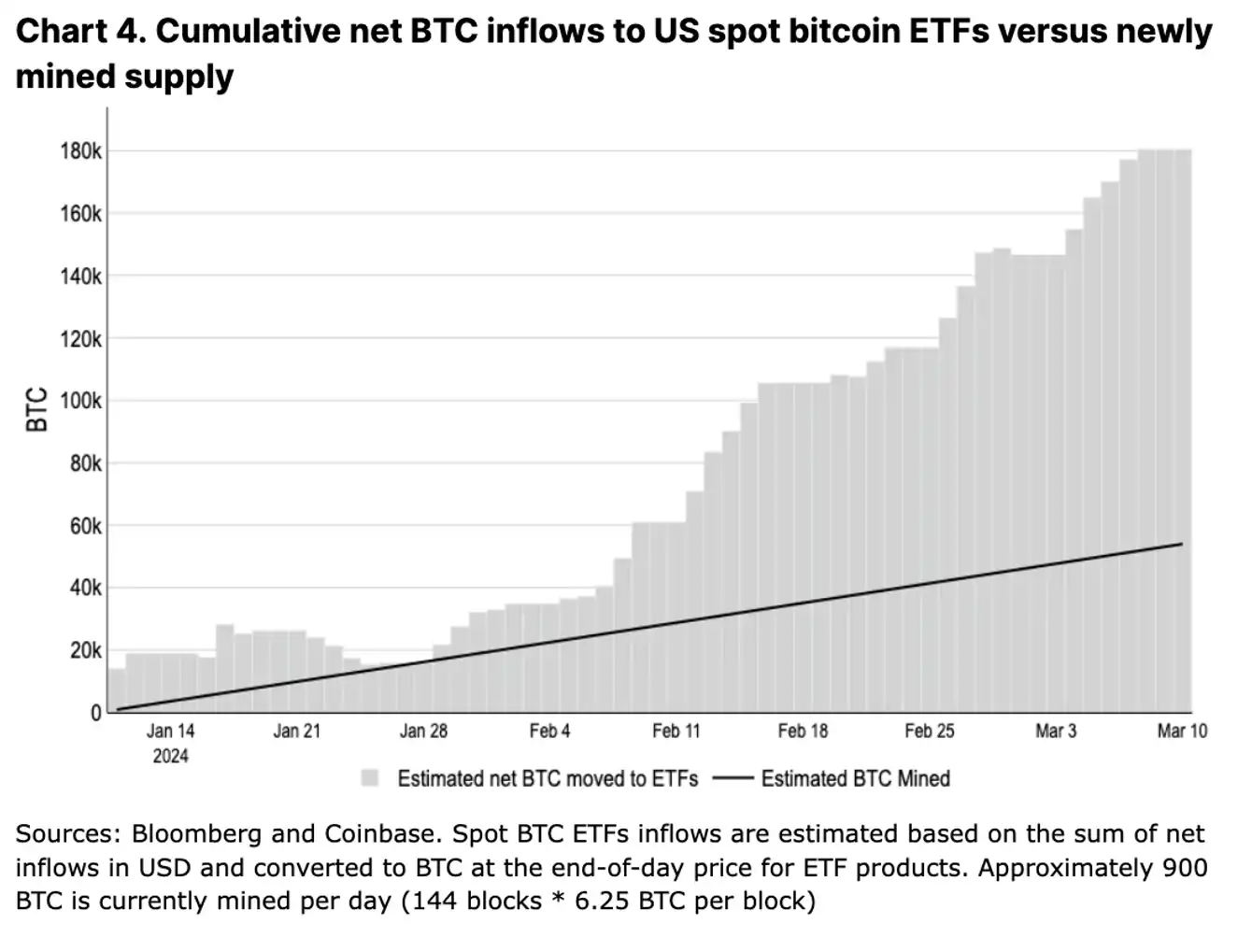 美国现货比特币 ETF 在前两个月已经吸引了 96 亿美金的净流入,管理的总资产达到了 550 亿美金。这意味着,在这段时间内,这些 ETF 持有的 BTC(18 万枚)的累计净增长比矿工产生的 5.5 万新比特币供应量高出近三倍(见图 3)。据彭博社报道,如果我们看一下全球所有现货比特币 ETF,这些受监管的投资工具目前持有约 110 万枚比特币,占总流通供应量的 5.8%。