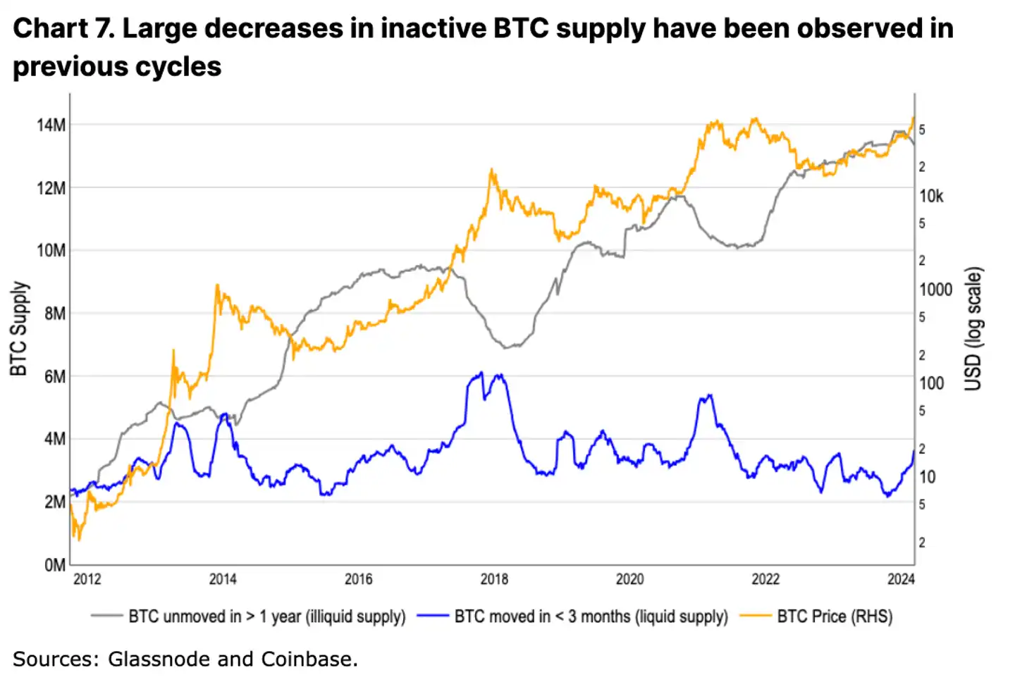 事实上,虽然新比特币供应限制是一个重要的考量因素,但它也只是诸多因素中的一种。自 2020 年初以来,可供交易的比特币(即流通和非流动性供应之间的差值)一直在下降,这与之前的周期相比发生了重大变化。但最近的数据表明,自 23 年第四季度初以来,活跃的 BTC 供应量(在过去 3 个月内发生过转移的比特币)大幅增加了 130 万,而在此期间新开采出来的比特币仅为约 15 万。尽管市场比过去更有能力吸收这种供应,但我们仍然认为,谨慎的做法是不要过度简化这些市场动态之间的,复杂的相互作用。