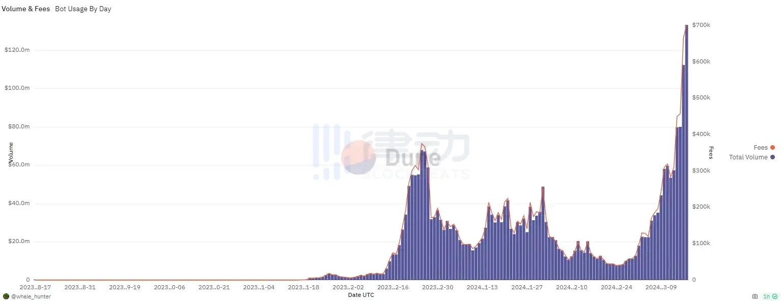 3 月 18 日,据 Dune 数据信息,Solana 链上的交易机器人 BonkBot 交易额连续四日创历史新高,其中昨日单日交易额达 1.33 亿美元,交易费用超 70 万美元。