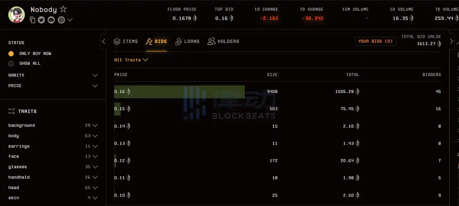 3 月 17 日,据 Blur 行情数据,NFT 项目 Nobody 携手周星驰发行的 Nobody NFT 上线仅仅不到两月就已跌破发行价格,目前地板价暂报 0.1677 ETH,7 日跌幅达 27.09%。