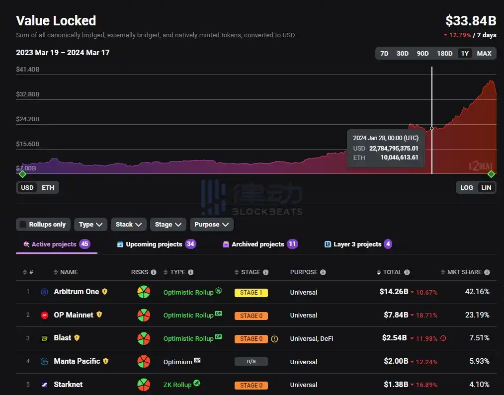 3 月 17 日,据 L2BEAT 数据显示,当前以太坊 Layer2 总锁仓量(TVL)跌至 338.4 亿美元,7 日跌幅为 12.79%。其中,锁仓量前五分别为: