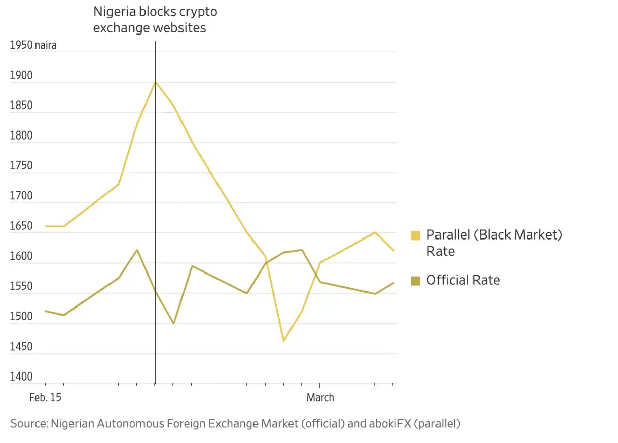 稳定币交易本质上变成了黑市,当地货币奈拉和美元之间的市场汇率,远低于政府汇率。据货币交易员称,Binance 是最受欢迎的交易所,成为检查黑市汇率的首选地。