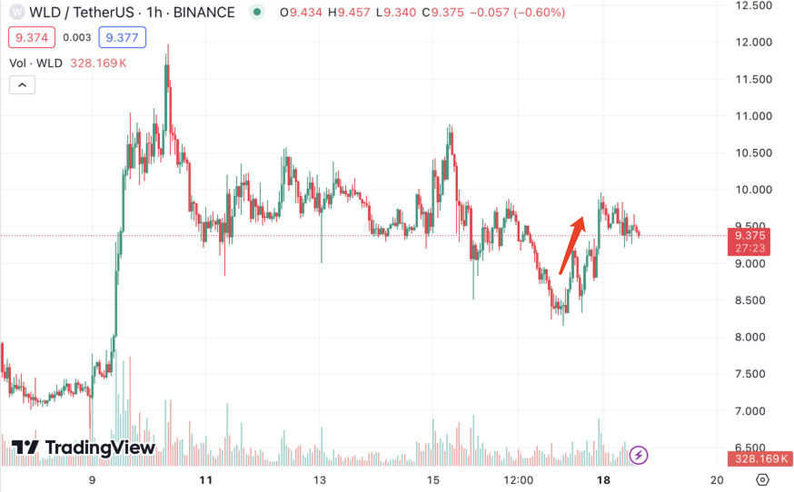 Worldcoin(WLD)24 小时涨幅 17%;现报价为 9.3 美元。