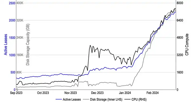 加密行业的去中心化计算(DeComp)领域也旨在成为集中式云计算的替代方案,部分原因是现有的 GPU 供应紧张。针对这一短缺问题提出的一种解决方案是在集体网络中重新利用闲置计算资源,并降低集中式云提供商的成本,Akash 和 Render 等协议应用了类似的解决方案。根据初步指标,此类项目在用户和供应商方面的使用似乎都在增加。例如,今年迄今为止,Akash 的活跃租约(即用户数量)增加了三倍(参见图 3),这主要是由于其存储和计算资源的使用量增加所致。