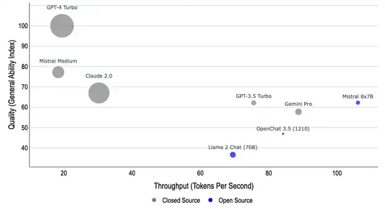 Hugging Face 上可用的模型范围从大型语言模型 (LLM) 到生成图像和视频模型,包括 Open AI、Meta 和 Google 等主要行业参与者以及独立开发人员的创作。一些开源语言模型甚至在吞吐量方面比最先进的闭源模型具有性能优势(同时保持可比的输出质量),这确保了开源模型和商业模型之间存在一定程度的竞争(见图 1)。重要的是,我们认为这个充满活力的开源生态系统与竞争激烈的商业部门相结合,已经使不良模型被竞争淘汰的行业成为可能。
