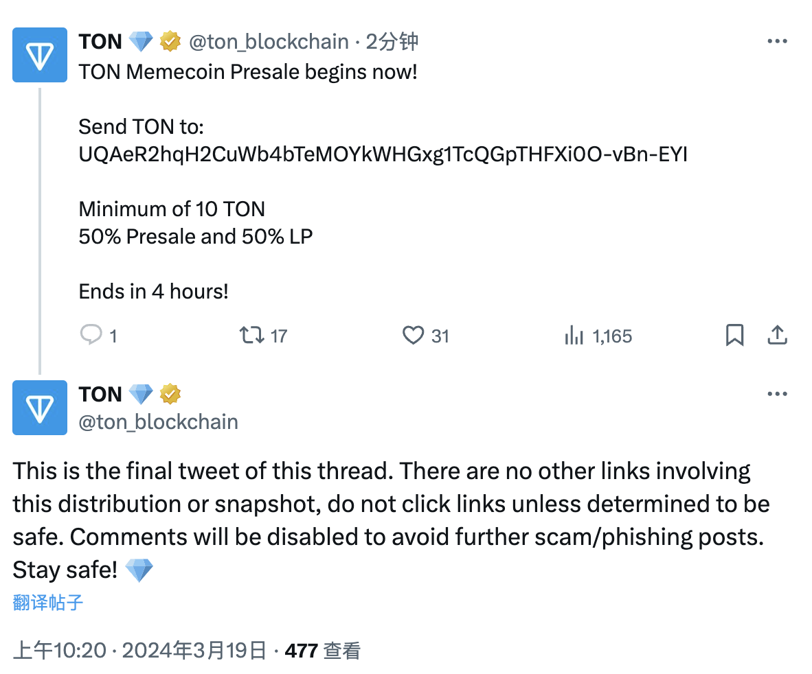 3 月 19 日,TON 区块链官方在社交媒体平台发布 meme 预售信息,参与者需向指定地址发送至少 10 枚 TON。随后,链上侦探 ZachXBT 表示 TON 区块链官方 twitter 账号已被盗用,TON 基金会主席 @steveyun ton 转发推文证实被盗信息。目前,此条诈骗推文已被删除。