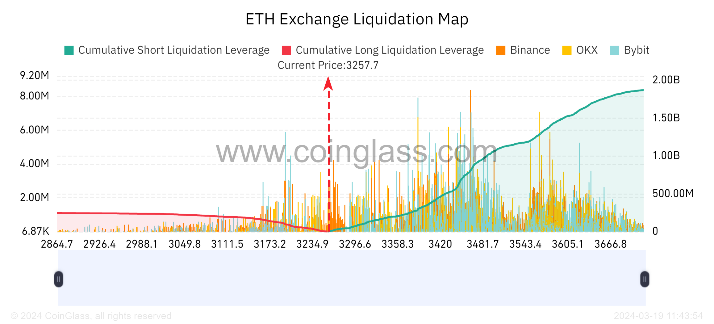 如果以太币跌破 3000 美元的心理价位,清算额将达到 2.37 亿美元。