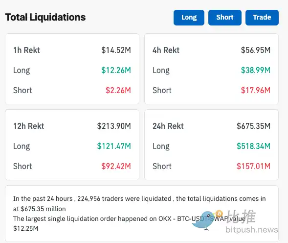 此外,获利了结导致杠杆比特币头寸的多头清算激增。据 CoinGlass 数据显示,过去 24 小时内,各中心化交易所的多头清算额约为 5.18 亿美元,昨日的多头清算额为 1.22 亿美元,上周周三至周五多头平仓金额约为 3.72 亿美元。