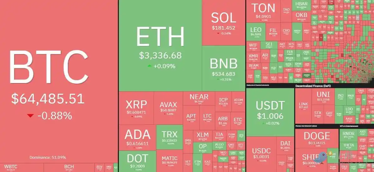 由于比特币的疲软,山寨币市场继续下跌,以太坊下跌超过 4%,收盘时交易价格为 3,335.66 美元,SOL 下跌 8%,狗狗币下跌 5%。周二前 200 名中的大多数代币都出现亏损,仅六种代币则实现了两位数的涨幅。