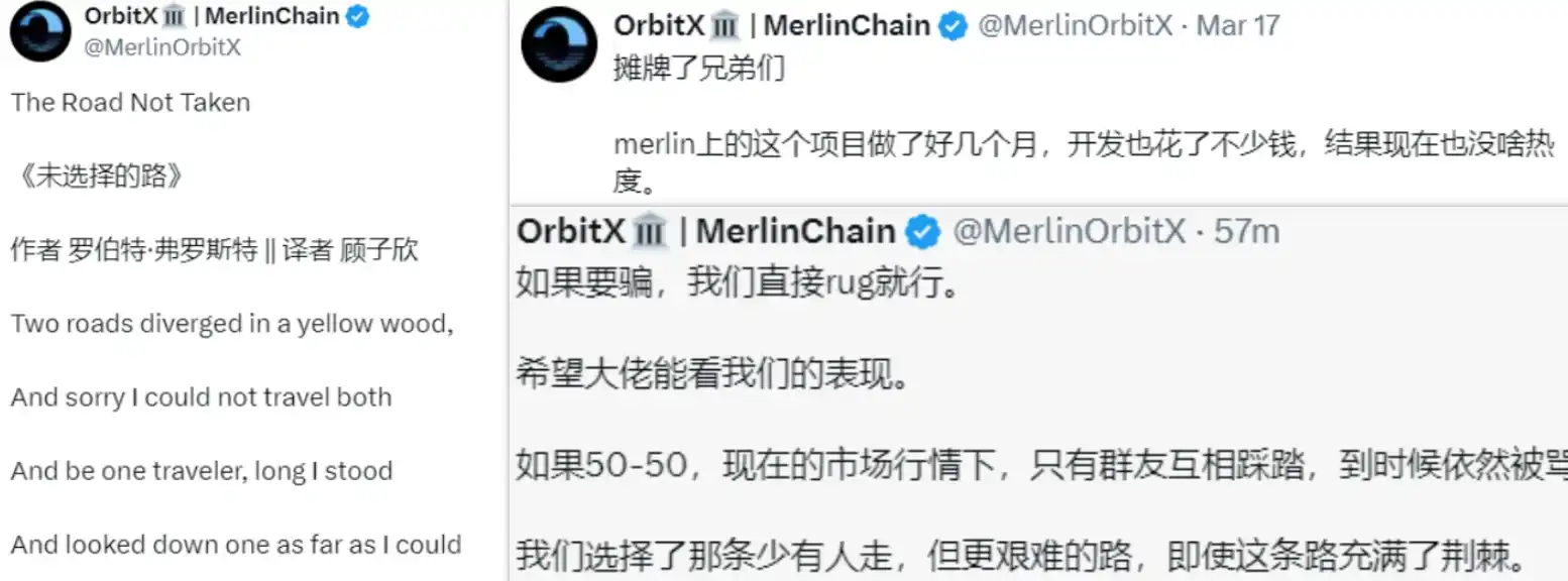 相比「我,秦始皇,打钱」的套路,@MerlinOrbitX 的募资形式还略显新奇,项目方多次发文构建了一个「努力开发却不得关注」的人设,但 MerlinChain 的捐赠模式热度不足,最终募集资金约数十万美元。
