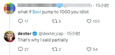 在以上代币转账操作后 1 小时,dexter 在 X 平台发文表示,超募部分即将开始发放,其将剩余的资金转移到币安部分兑换成稳定币,以避免 SOL 大幅贬值。在其向币安转账的前后时点,SOL 币价约为 178 USDT,接近当日最低点,部分用户认为是其主动抛售行为导致了 SOL 价格下跌,更多用户认为 SOL 上行空间更大,此举稀释了项目整体价值。随之而来的,还有如下声音:「我自己不会做波段?」「你要卖成稳定币,为啥不募稳定币」……