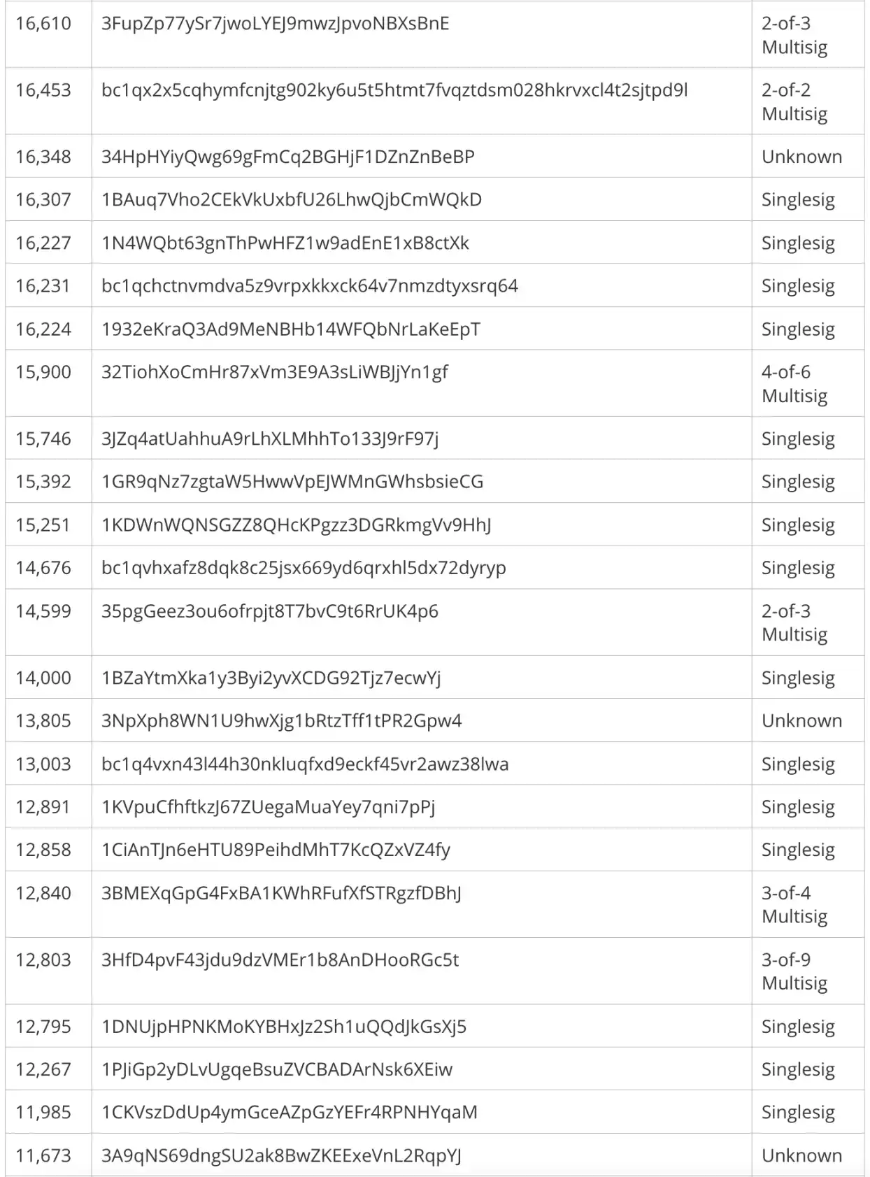 尽管很难确定比特币最富有的实体以及他们拥有的比特币数量,但确定最富有的比特币地址却很容易。有几个网站实时跟踪这些地址,这些地址的特征可以提供很多有关比特币安全存储的线索。