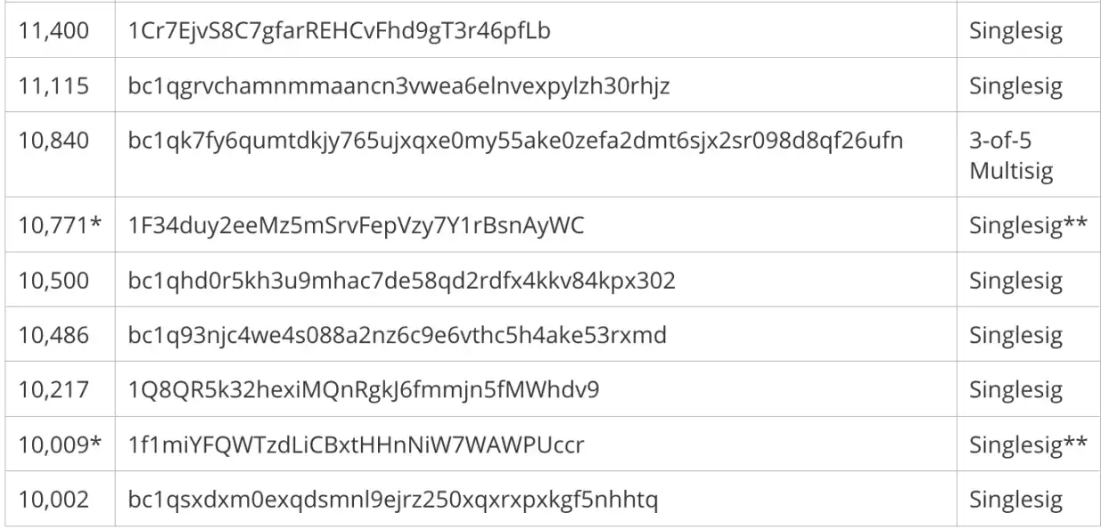 正如我们在讨论机构级阈值安全性的文章中所解释的那样,这 53 个单签名地址很可能使用 SSS 或 MPC。然而,其中两个地址不太可能使用 MPC,因为它们是在 2018 年之前创建的,当时发明了第一个用于 ECDSA 的 MPC 阈值协议。这些地址可能使用的是 SSS。