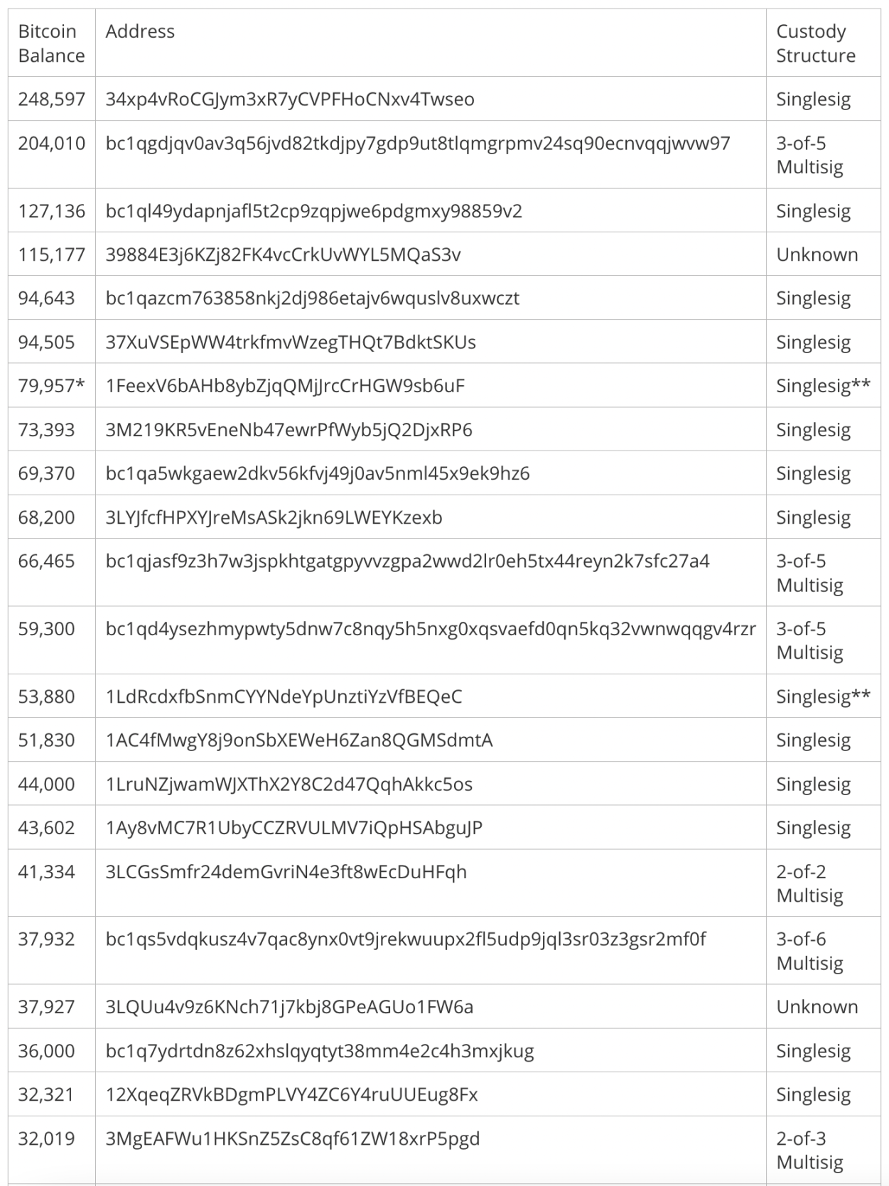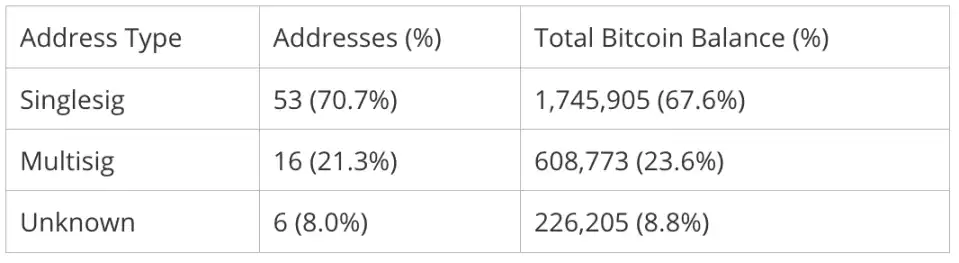 其中一些实体使用多重签名地址,具有典型的法定人数多签结构,如 2/3 和 3/5,但也有几个不寻常的法定人数。许多实体使用单签名地址,这些地址可能正在使用 SSS 或 MPC。有关 SSS 或 MPC 阈值法定人数的详细信息从未在区块链上公开记录,这限制了本次调查的范围。其中一些单签名地址可能根本没有使用任何阈值安全性,这意味着目前价值超过 4 亿美元的某些比特币储备明显缺乏安全性。