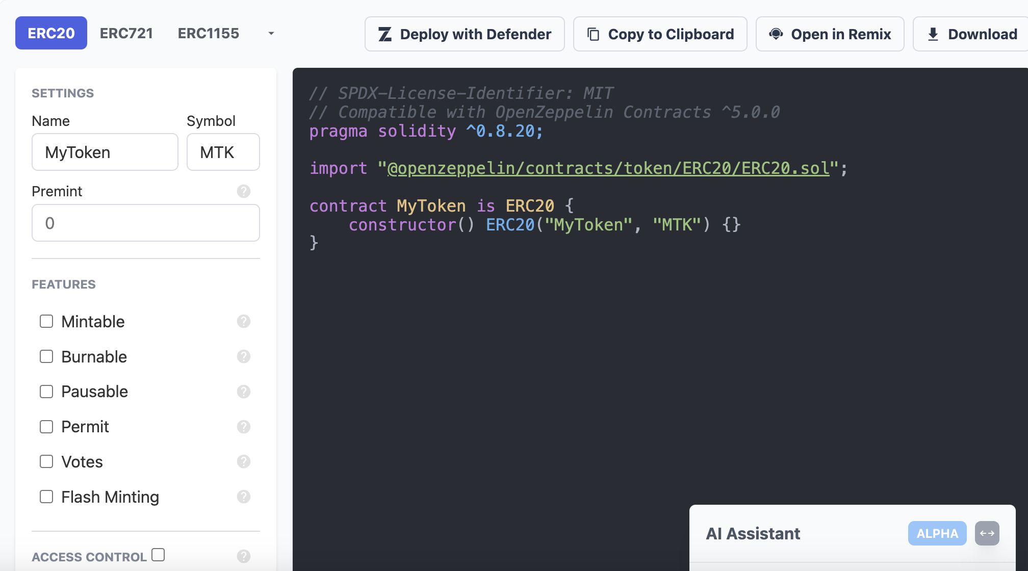 在 OpenZeppelin 上,对几个常用的 token 发行合约进行了模块化的展示,我们可以直接在其中选择功能,然后直接跳转到 Remix。