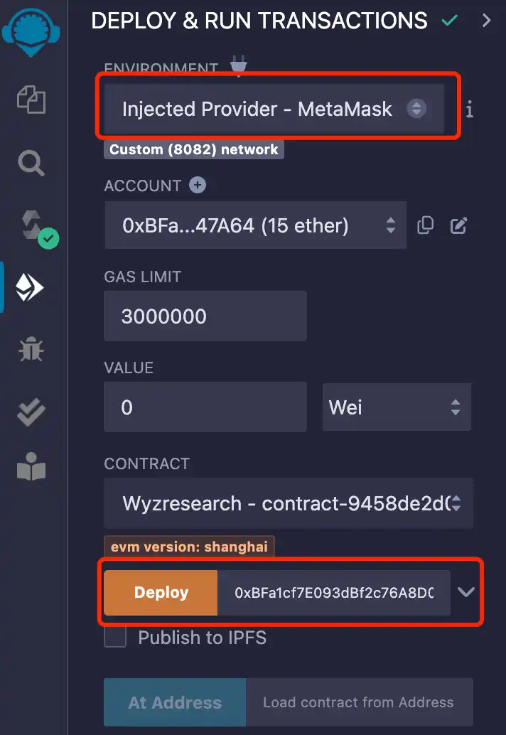 在钱包已经修改正确的情况下,点击左上角的账户部分,这个位置代表支付 gas 的账户,而下面这个位置代表部署的地址,选择好之后,如下显示: