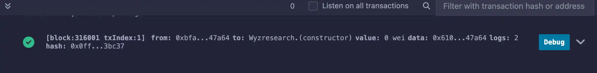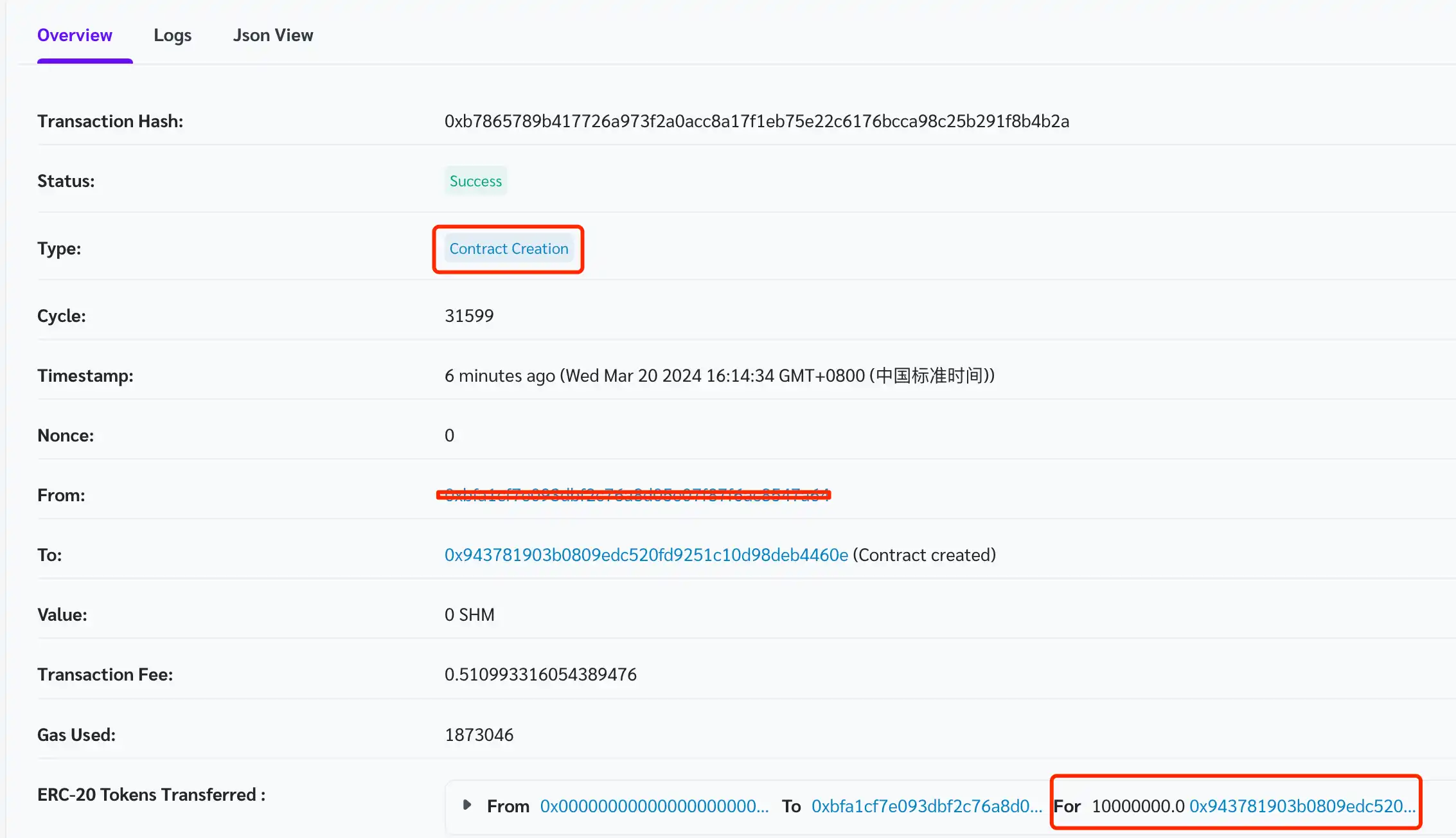当完成部署后,通过钱包中的按钮点击进入浏览器查看交易时,可以发现,刚刚我们完成了一个合约创建的动作,而合约执行过程中,向其中的一个代币发送了相应的代币。