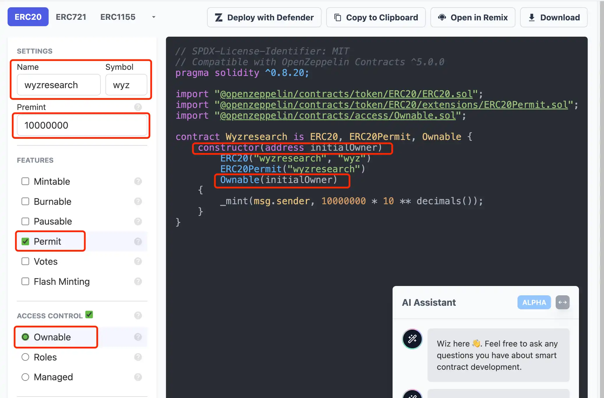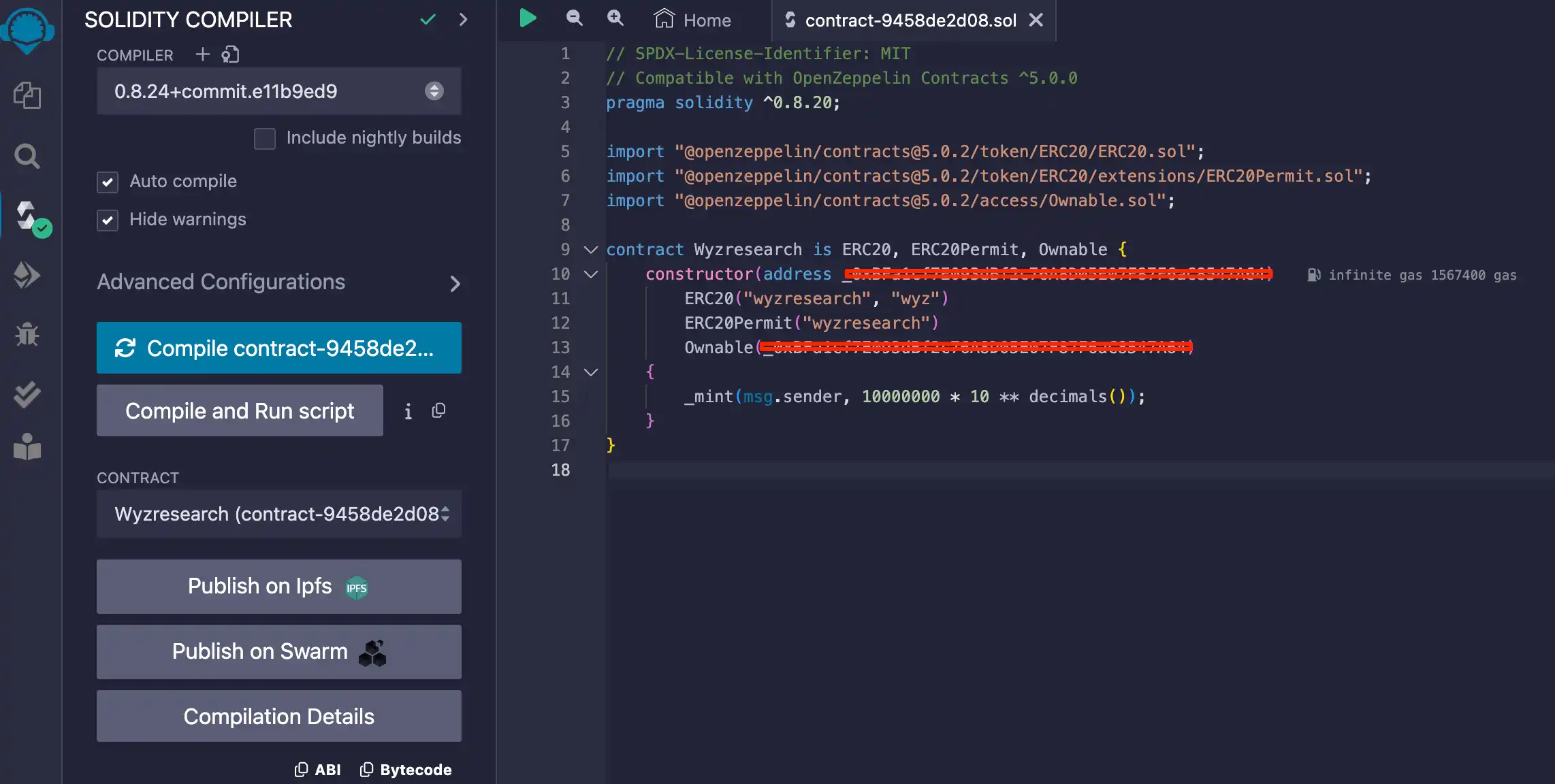 随后我对这个发行 token 的合约进行了设置,使用 Wyz Research 的全名,Wyz 的缩写,并且选择了功能里的预发行,并且对合约进行了控制所有权的指定。通过这些操作,右侧的合约代码中,多了第一个红框中显示的建造者,而预发行的代币也有了地址指向。