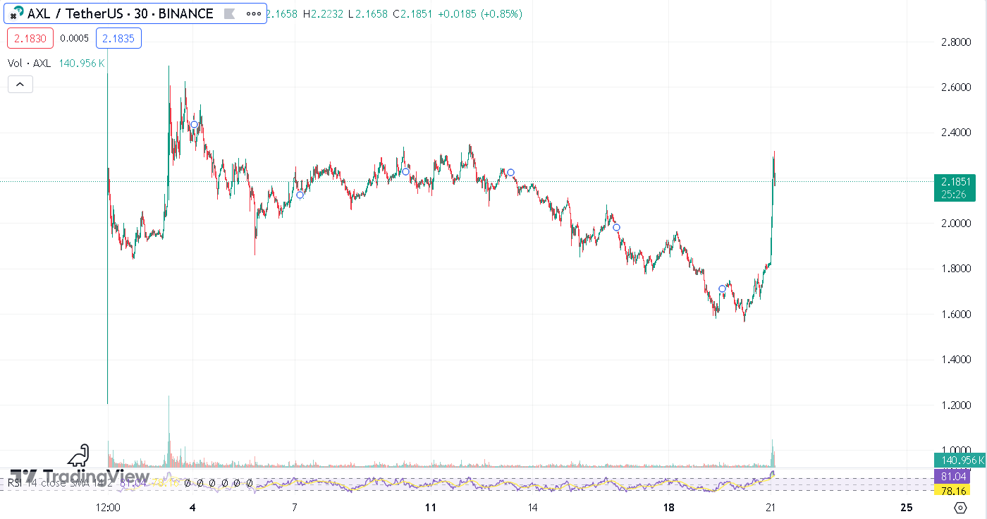 比特币回调结束后,加密行情整体回升,跨链互操作项目 Axelar 原生代币 AXL 涨幅明显,据 Tradingview 数据,截至撰稿时,AXL 价格短时突破 2.3 美元,24 小时涨幅达 22.23%。