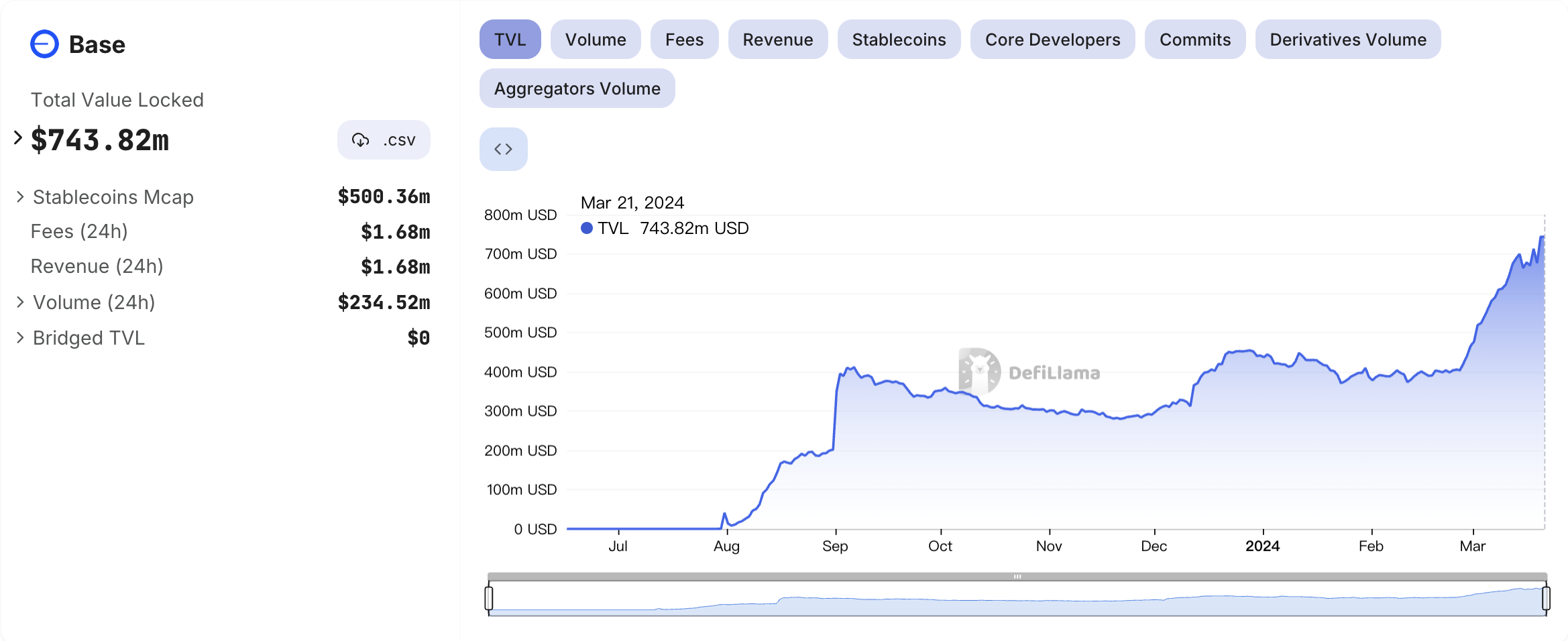 Base 的 TVL 在三月涨幅突出,得益于昨日 meme 狂潮,Base TVL 突破 7 亿美元,截止撰稿时,TVL 总量为 7.43 亿美元,达到历史新高。背靠 Coinbase,Base 似乎正在成为以太坊生态新的活力增长点。