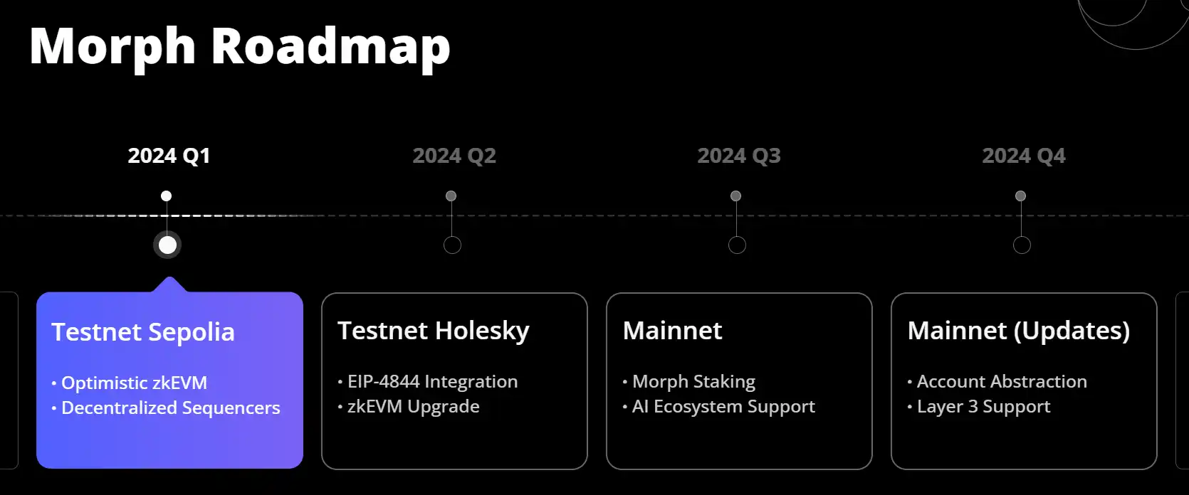 项目在 2024 年按季度分成四个路线,在第一季度启动测试网 Sepolia,第二季度启动测试网 Holesky 并进行 EIP-4844 集成、zkEVM 升级,第三季度上线主网,第四季度进行主网更新,目前进行到第二个路线。
